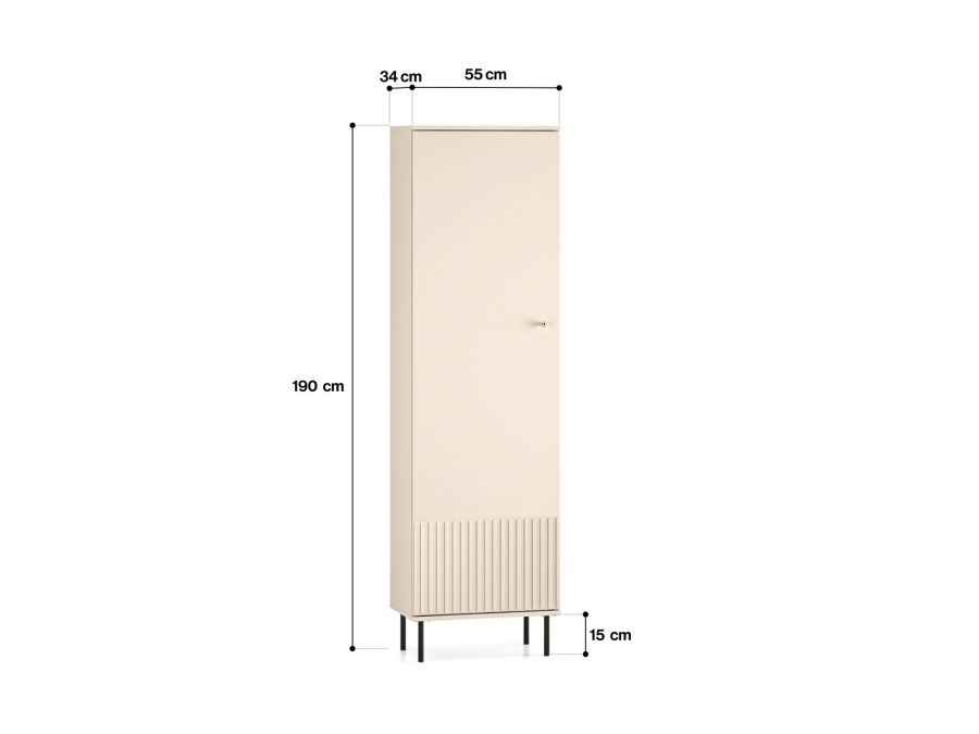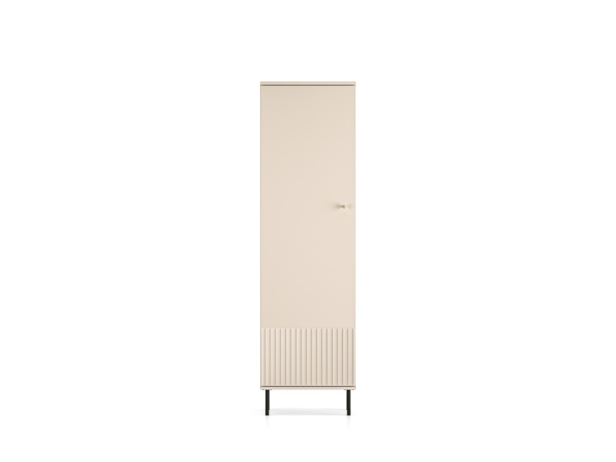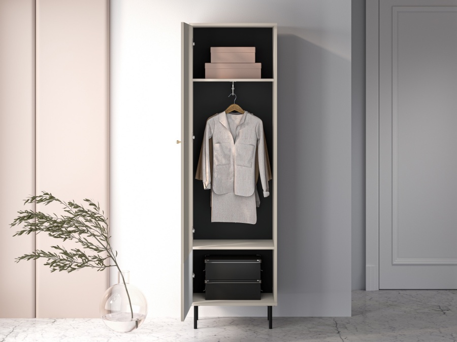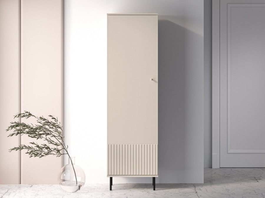 Úzka jednodverová skriňa je ideálnym riešením pre malé priestory. Obsahuje hornú policu, výsuvnú vešiakovú tyč na oblečenie a dolnú policu na ďalšie úložné potreby. Minimalistický dizajn s jemným drážkovaním na spodnej časti a zlatou úchytkou dodáva elegantný vzhľad. Vďaka svojej kompaktnosti sa hodí do predsiene, spálne alebo šatníka.