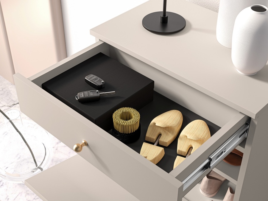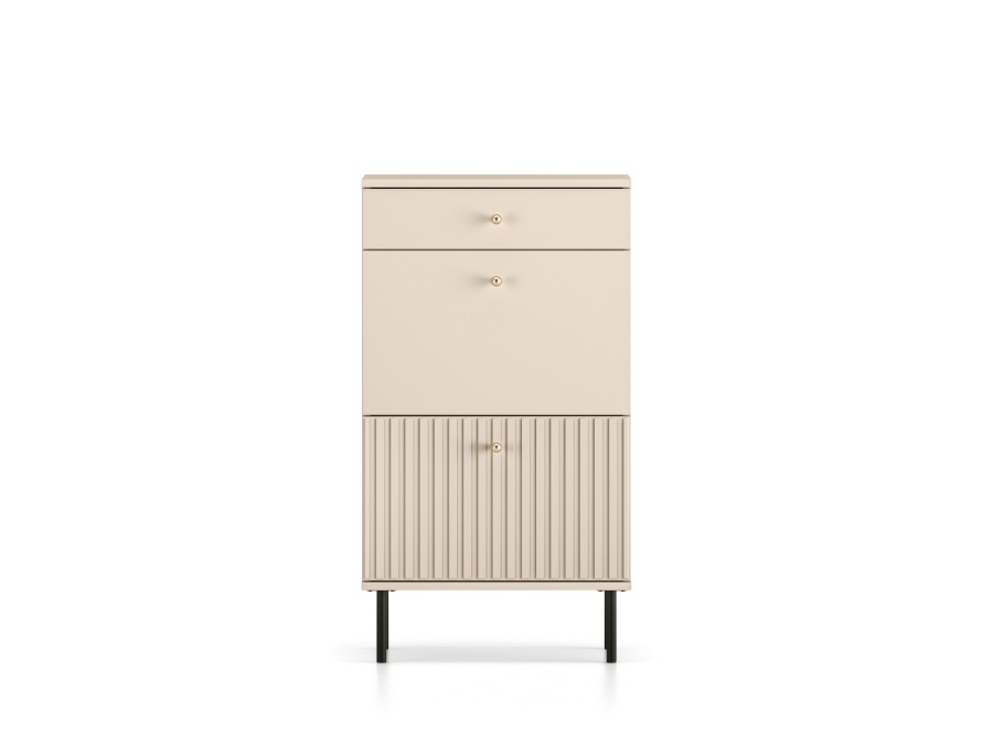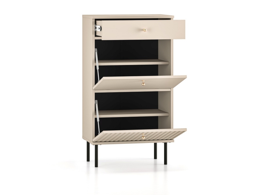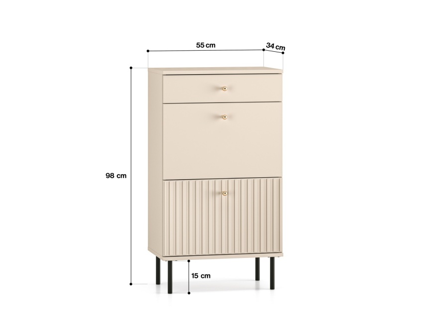 Botník je ideálnym riešením na úsporné a štýlové uskladnenie obuvi. Ponúka kombináciu zásuvky a výklopných priehradiek, ktoré zabezpečujú prehľadnosť a jednoduchý prístup. Jeho moderný dizajn s jemným drážkovaním a kovovými úchytkami dodá vášmu interiéru sofistikovaný vzhľad.
