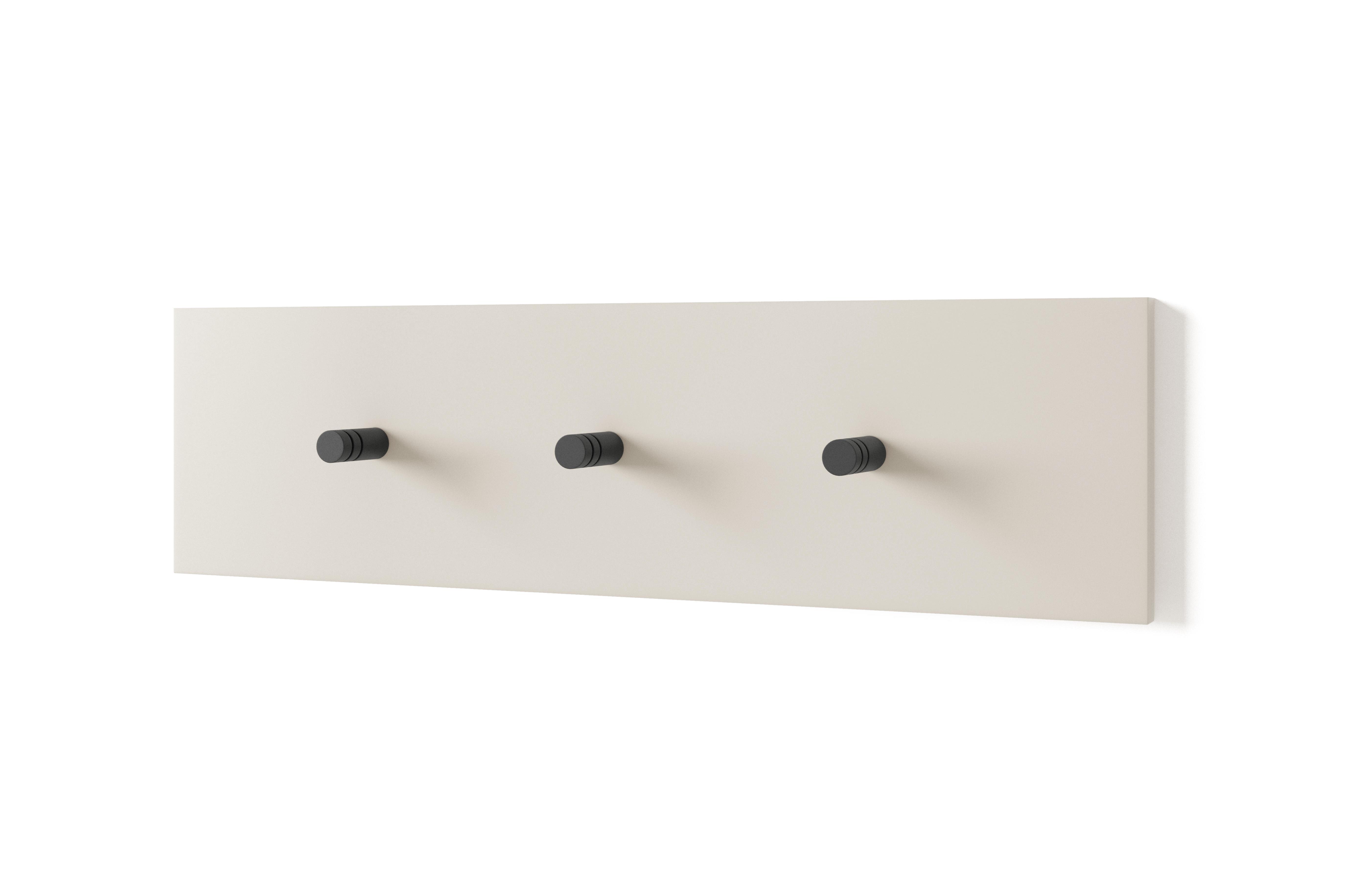 Nástenný vešiak s tromi čiernymi háčikmi na svetlej doske. Jednoduchý, moderný dizajn vhodný na zavesenie kabátov, tašiek či doplnkov. Skvelo zapadne do každej predsiene alebo chodby.