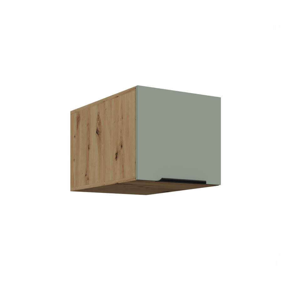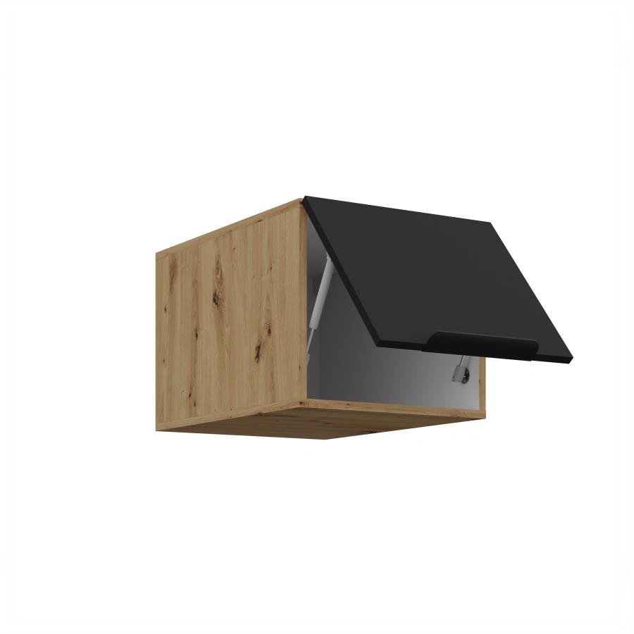Horná skrinka Aria AR 40 NAGU-36 1F je výklopná závesná skrinka, ideálna na umiestnenie nad digestor alebo ako doplnkový horný modul v kuchyni. Dvierka sa otvárajú nahor pomocou plynových piestov, čo zabezpečuje pohodlnú manipuláciu a plynulý chod. Dopĺňa ich čierna úchytka, ktorá zvýrazňuje elegantný vzhľad skrinky. Korpus je vyhotovený v dekóre dreva Dub Artisan a dvierka sú dostupné v 5 moderných farebných prevedeniach.