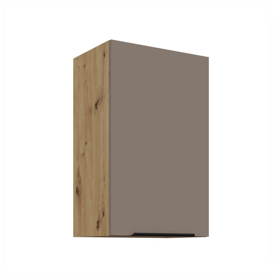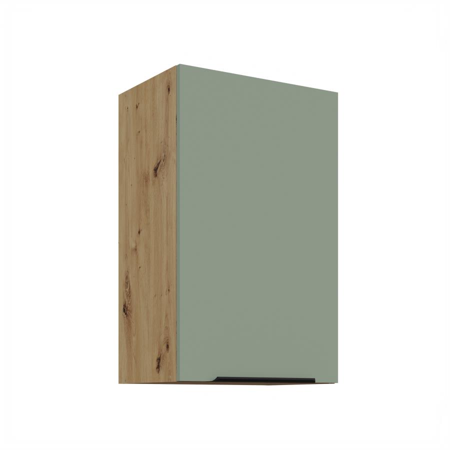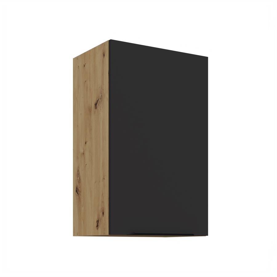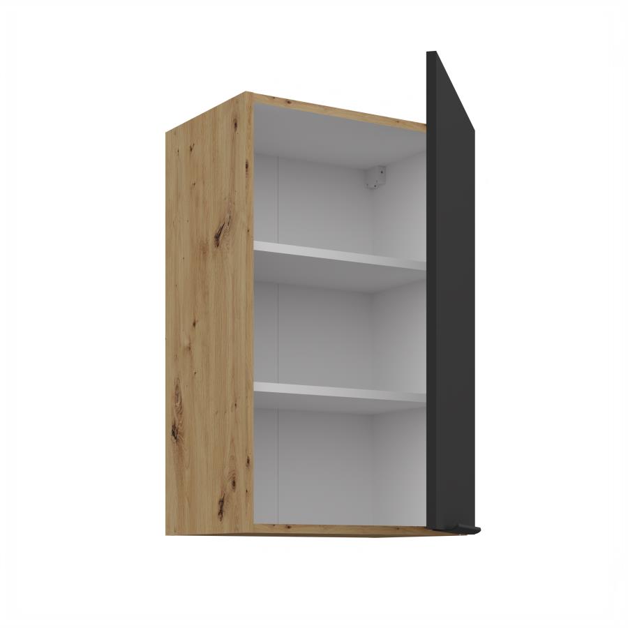 Horná skrinka Aria AR 45 G-72 1F je 1-dverová skrinka vhodná na praktické a moderné usporiadanie kuchynského priestoru. Dvierka sú doplnené čiernou úchytkou, ktorá dodáva skrinke elegantný a moderný vzhľad. Vnútorný priestor je rozdelený dvoma policami, ktoré ponúkajú dostatok úložného miesta. Korpus je vyhotovený v dekóre dreva Dub Artisan a dvierka sú dostupné v 5 moderných farebných prevedeniach.