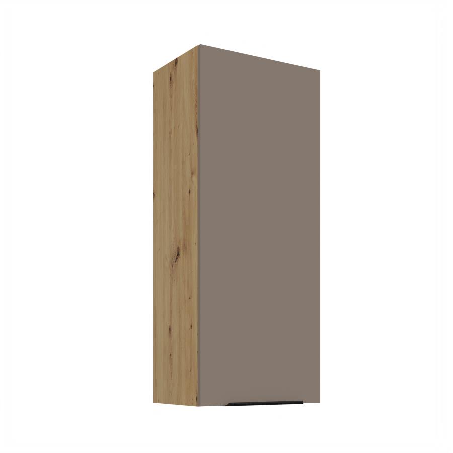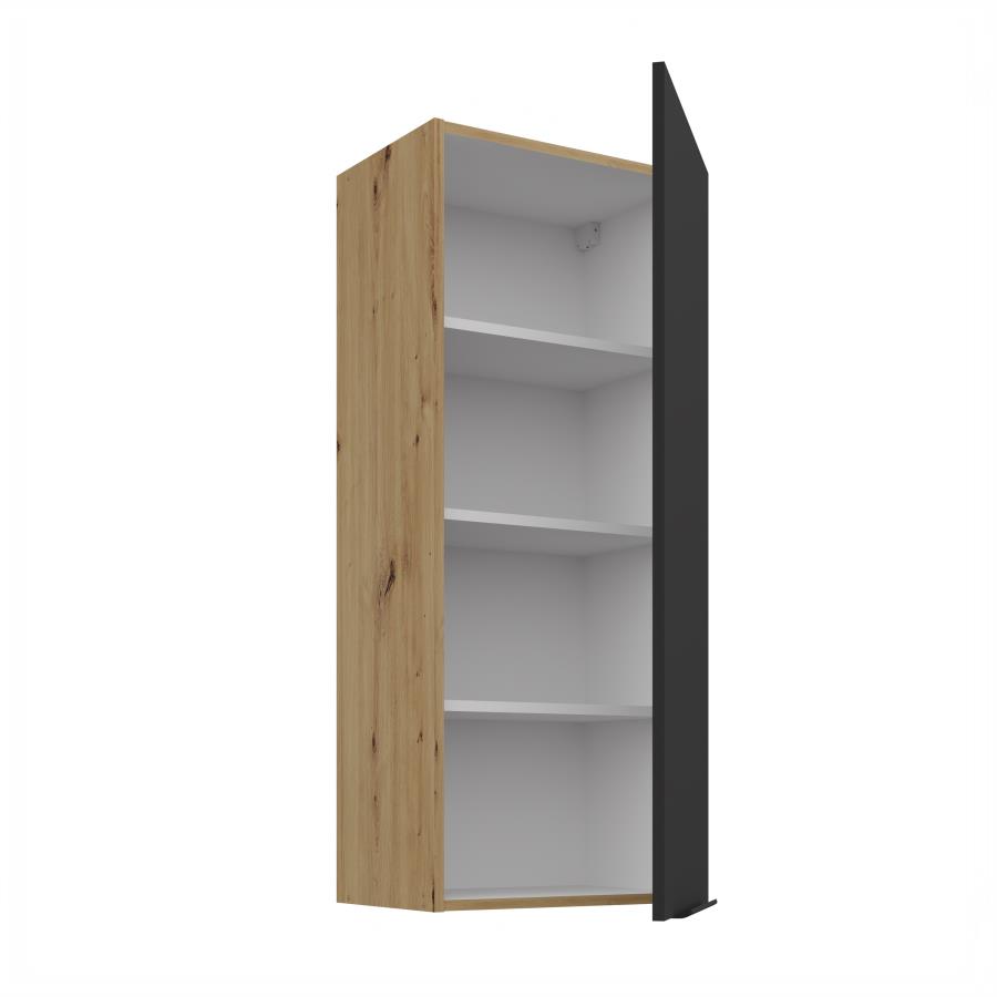 Horná skrinka Aria AR 45 G-108 1F je 1-dverová skrinka určená na moderné a praktické usporiadanie kuchynského priestoru. Dvierka sú doplnené čiernou úchytkou, ktorá zvýrazňuje elegantný vzhľad skrinky. Vnútorný priestor je rozdelený tromi policami, ktoré poskytujú dostatok úložného miesta. Korpus je vyhotovený v dekóre dreva Dub Artisan a dvierka sú dostupné v 5 moderných farebných prevedeniach.