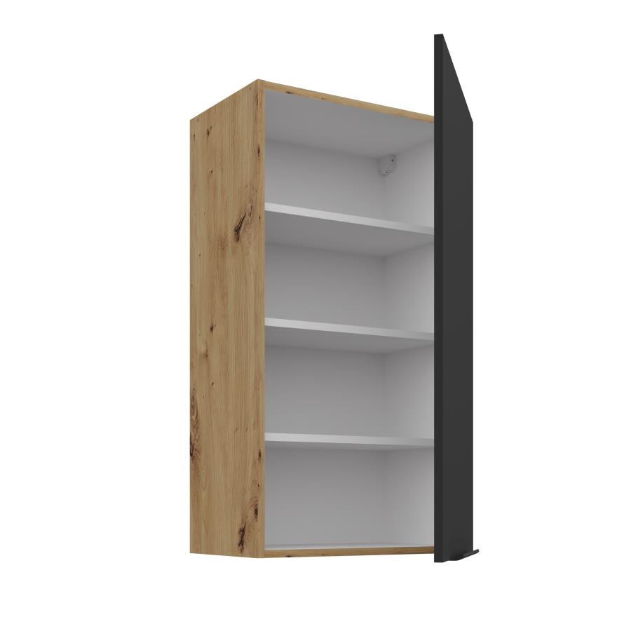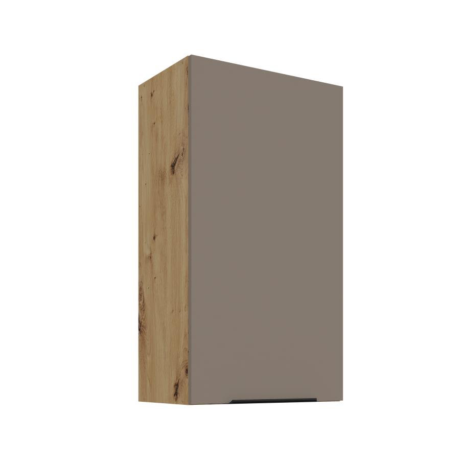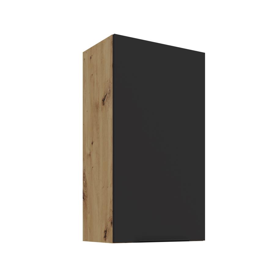 Horná skrinka Aria AR 50 G-90 1F je 1-dverová skrinka ideálna pre moderné a praktické riešenie kuchynského priestoru. Dvierka sú doplnené čiernou úchytkou, ktorá dodáva skrinke elegantný a štýlový vzhľad. Vnútorný priestor je rozdelený troma policami, ktoré ponúkajú dostatok miesta. Korpus je vyhotovený v dekóre dreva Dub Artisan a dvierka sú dostupné v 5 moderných farebných prevedeniach.