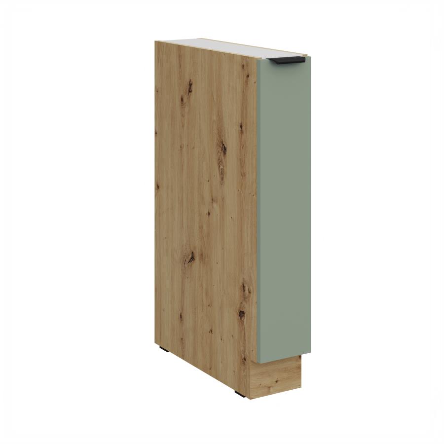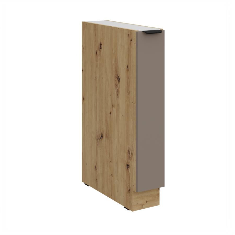 Spodná skrinka Aria AR 15 D CARGO BB je úzka výsuvná skrinka, ideálna na praktické uskladnenie fliaš, korenín či kuchynských doplnkov. Vďaka svojmu kovovému košovému systému umožňuje ľahký prístup k uloženým predmetom a efektívne využíva aj menší priestor v kuchyni. Dvierka sú doplnené čiernou úchytkou, ktorá podčiarkuje elegantný a moderný vzhľad skrinky. Korpus je vyhotovený v dekóre dreva Dub Artisan a dvierka sú dostupné v 5 moderných farebných prevedeniach.