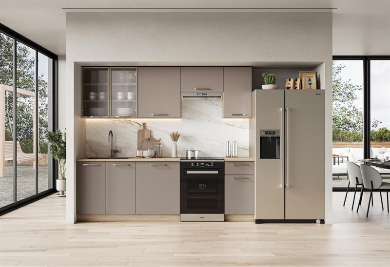 zachováva jednotný dizajn celej kuchyne. Pracovná doska je v svetlom dekore