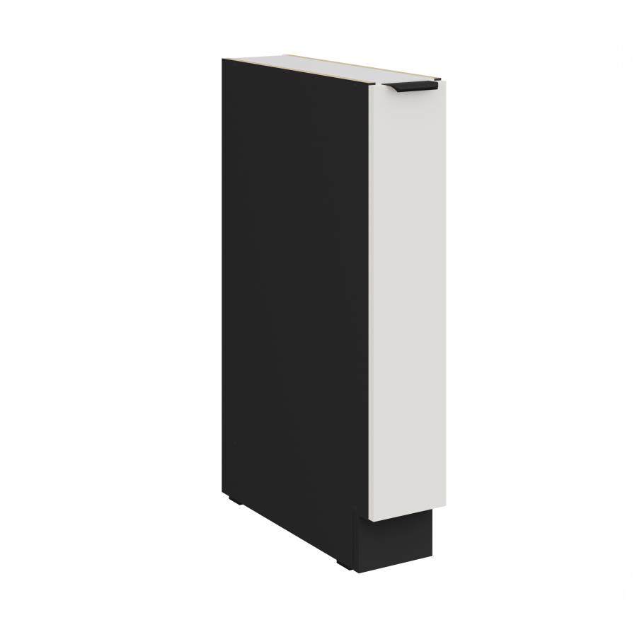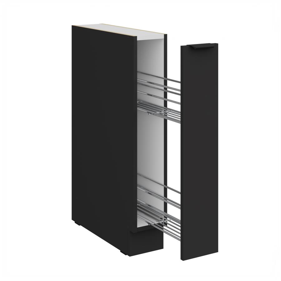 Spodná skrinka Aria BL 15 D CARGO BB je úzka výsuvná skrinka, ideálna na praktické uskladnenie fliaš, korenín či kuchynských doplnkov. Vďaka svojmu kovovému košovému systému umožňuje ľahký prístup k uloženým predmetom a efektívne využíva aj menší priestor v kuchyni. Dvierka sú doplnené čiernou úchytkou, ktorá podčiarkuje elegantný a moderný vzhľad skrinky. Korpus je vyhotovený v dekóre čierna a dvierka sú dostupné v 5 moderných farebných prevedeniach.