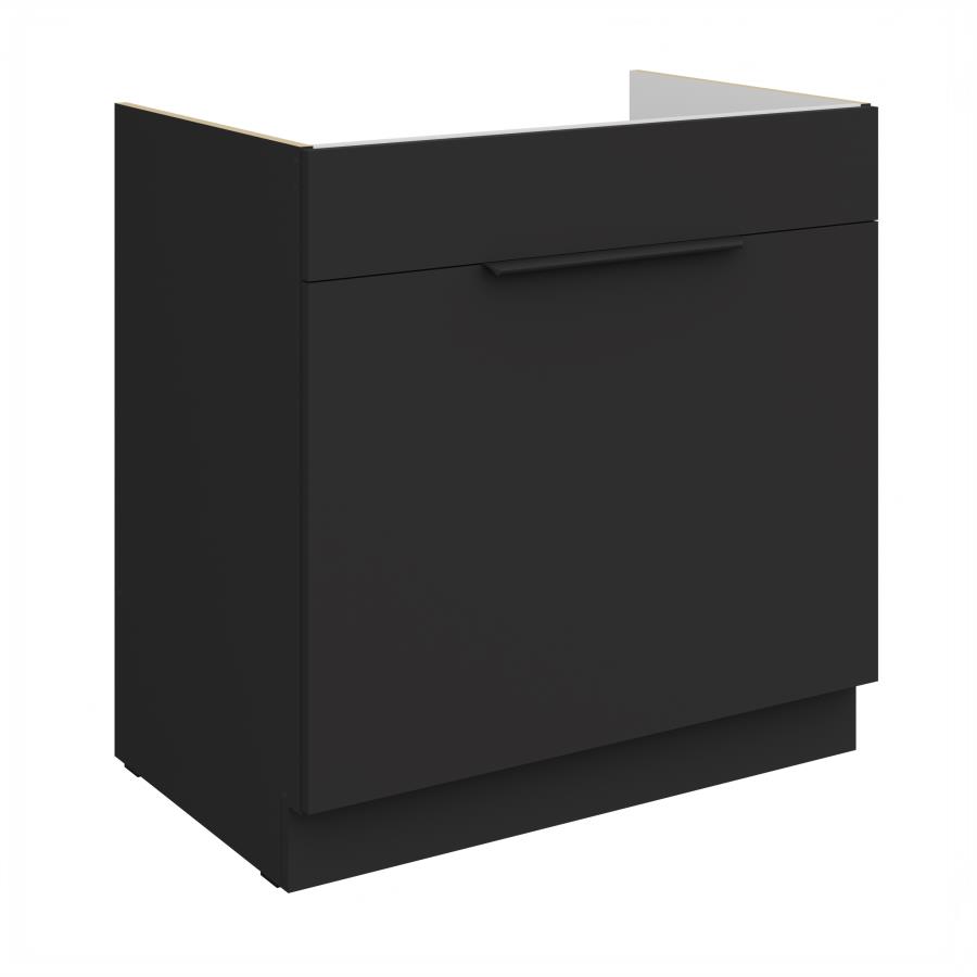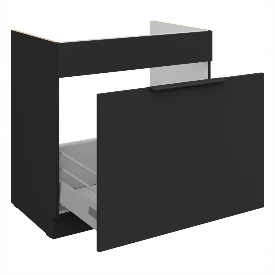 Spodná skrinka Aria BL 80 ZL 1S BB je moderná skrinka určená pod drez. Je vybavená falošnou zásuvkou v hornej časti a veľkým spodným výklopným priestorom, ktorý poskytuje dostatok miesta na odpadkové koše, čistiace prostriedky alebo iné kuchynské potreby. Zásuvky sú osadené mechanizmom pre plynulý a tichý chod, čo zabezpečuje pohodlné každodenné používanie. Čelá zásuviek dopĺňajú čierne úchytky, ktoré podčiarkujú moderný vzhľad skrinky. Korpus je vyhotovený v odtieni čierna a dvierka sú dostupné v 5 moderných farebných prevedeniach.