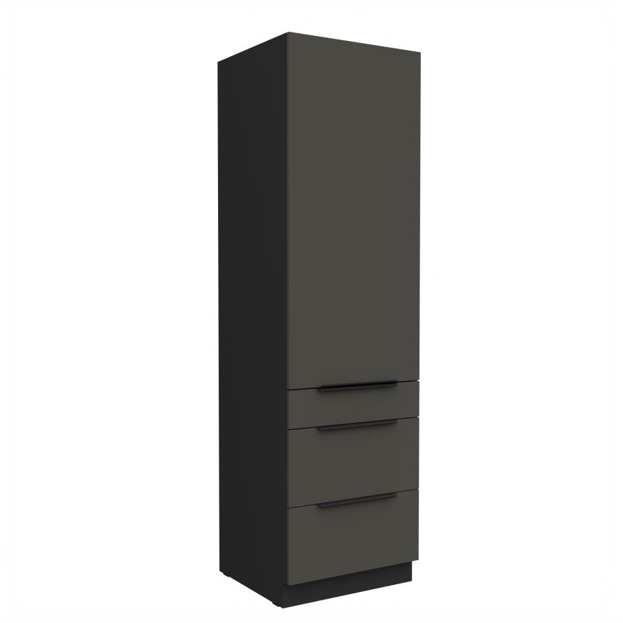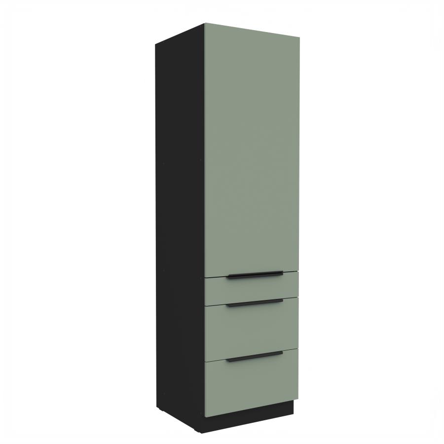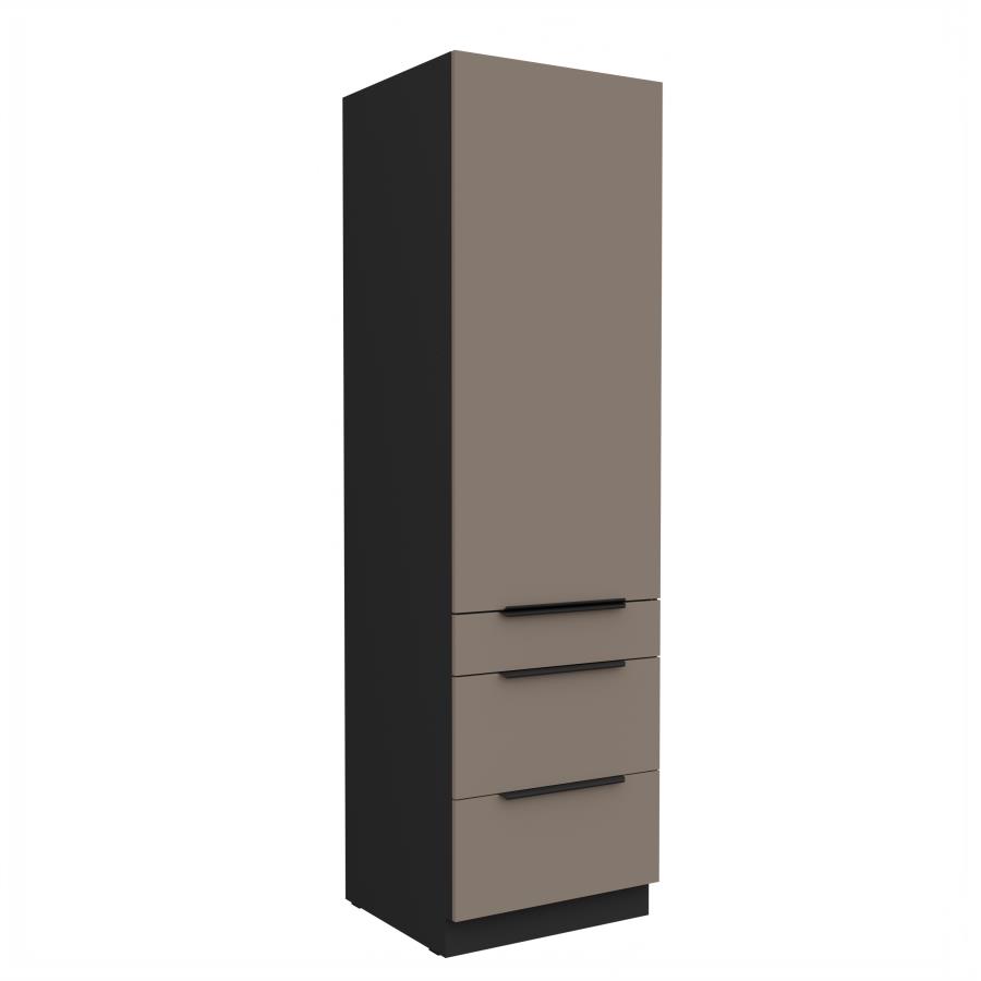 Vysoká potravinová skrinka Aria BL 60 DKS-210 3S1F je praktickým riešením pre modernú kuchyňu, ktoré kombinuje úložný priestor so zásuvkami. Horná časť skrinky je vybavená dvierkami s vnútornými policami, ideálnymi na uskladnenie potravín, riadu alebo kuchynských doplnkov. Spodná časť obsahuje tri priestranné zásuvky s mechanizmom pre plynulý a tichý chod, čo zaručuje pohodlné používanie. Dvierka sú doplnené čiernymi úchytkami, ktoré dodávajú skrinke elegantný a moderný vzhľad. Korpus je vyhotovený v odtieni čierna a dvierka a čelá zásuviek sú dostupné v 5 atraktívnych farebných prevedeniach.